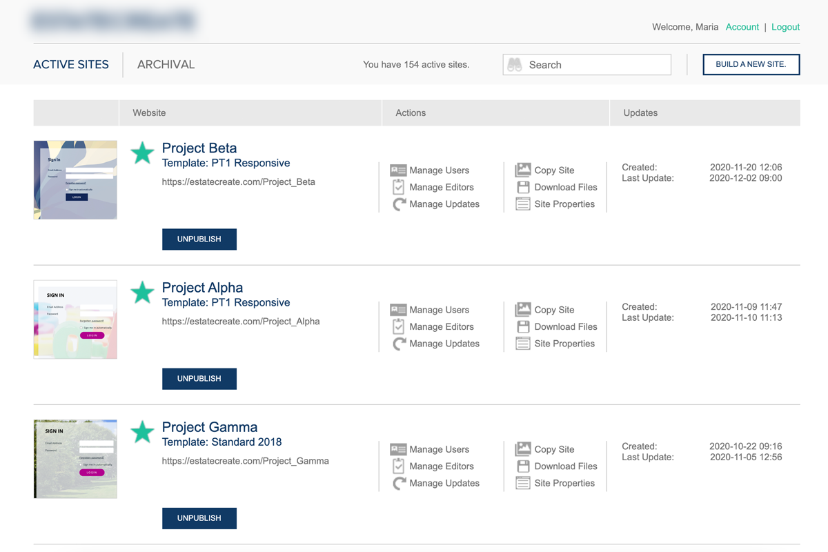 Estatecreate.com is a website construction portal, providing all necessary tools to create and manage data room sites for real estate properties, including a back-office with a bunch of options to supervise administrator and user accounts, control access to data and documents, as well as obtain the user activity reports and statistics.